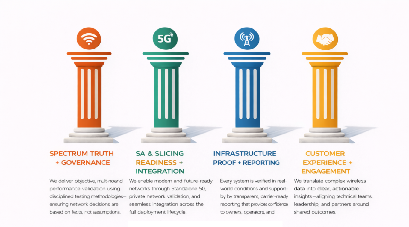 Our team is composed of experienced RF engineers and field professionals who understand that wireless excellence is not theoretical. It is earned through methodical testing, transparent reporting, and a commitment to getting the details right—every time. We approach each engagement with the mindset that our work will be reviewed, challenged, and relied upon by carriers, enterprises, and public-sector stakeholders.